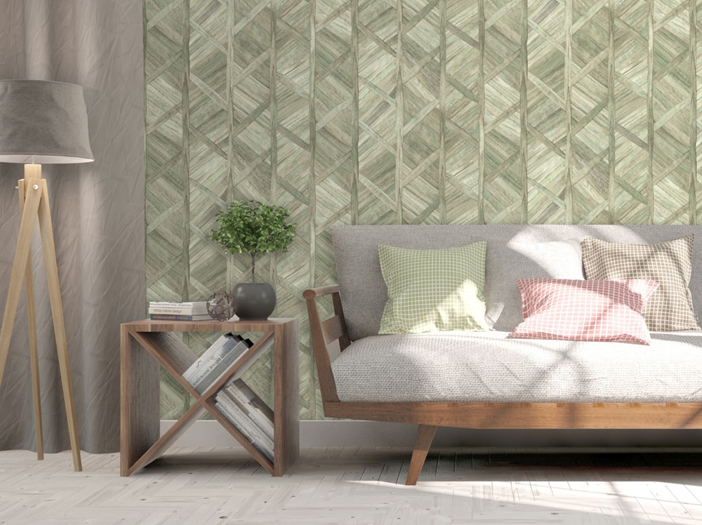 Natural materials bring coziness into interior. Wood paneling design in shades of green, beige and brown.