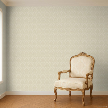 Beige non-woven wallpaper with baroque damask pattern, fabric texture, delicate semi-gloss background.