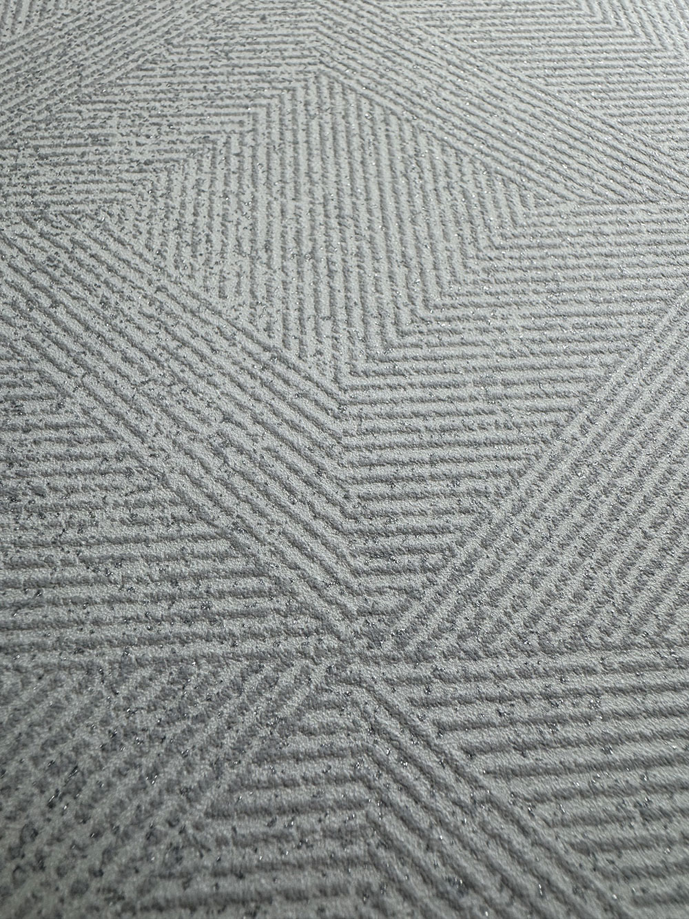 Geometric non-woven wallpaper, shades of gray, small metallic glitter.