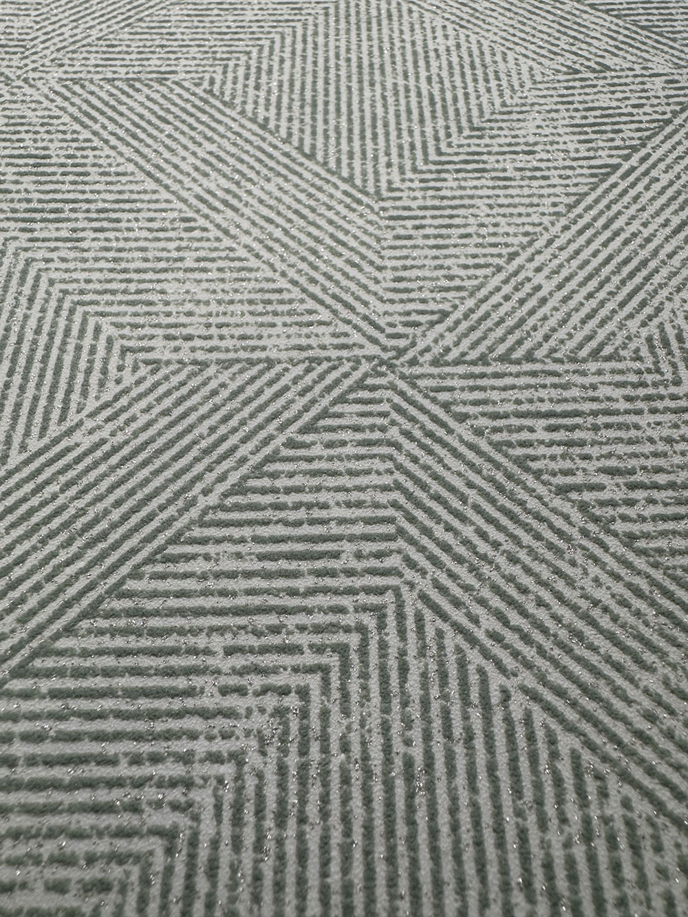 Geometric non-woven wallpaper, shades of green, small metallic glitters.