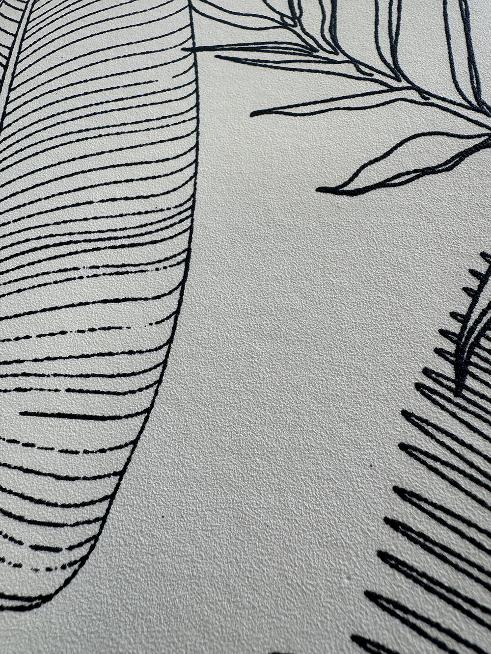White non-woven wallpaper, black outlines of tropical leaves.