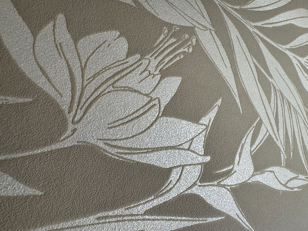 Matte beige non-woven wallpaper, embossed glossy leaves.