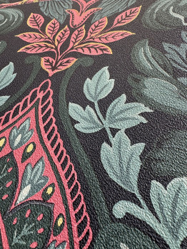 Original non-woven wallpaper - ornamental natural patterns and birds; shades of green, pink and ocher, sand texture.