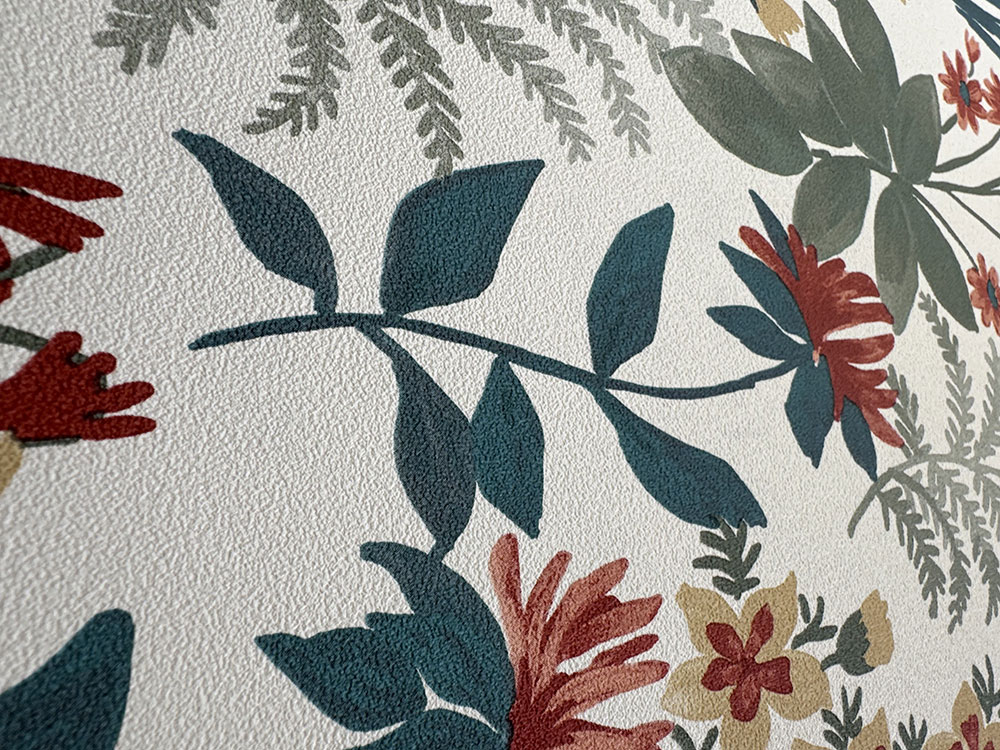 Non-woven wallpaper, flower motifs in shades of green, turquoise, brick red and beige. Fine sand texture.