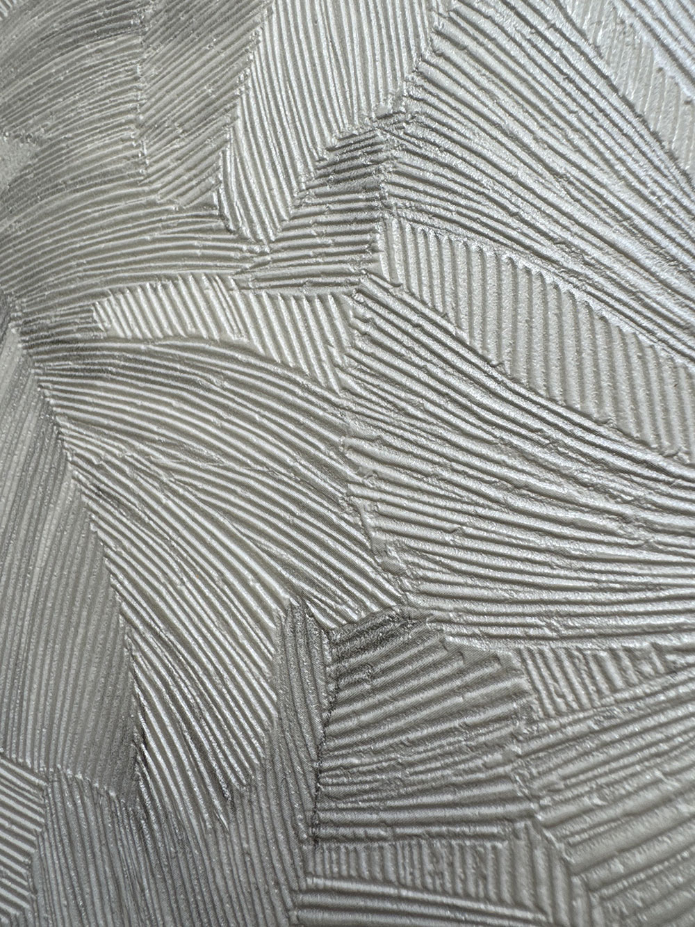 Embossed, white-gray non-woven wallpaper, Monstera leaf motifs.