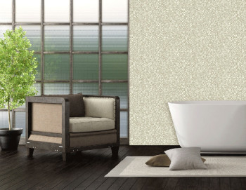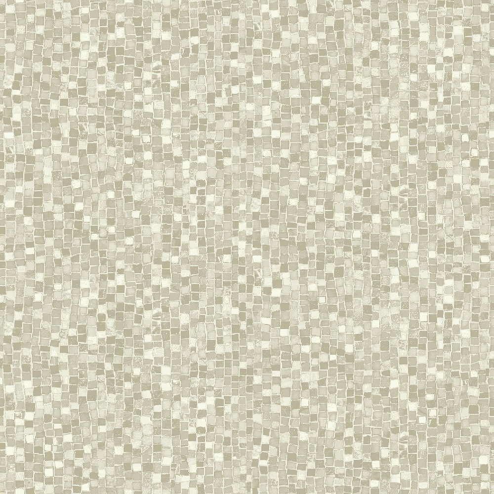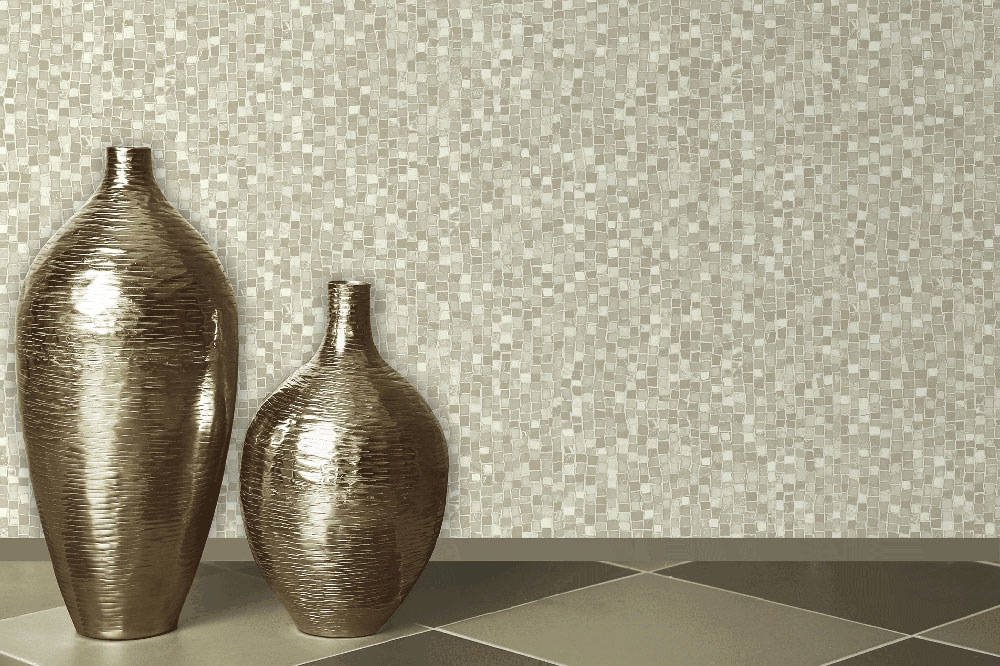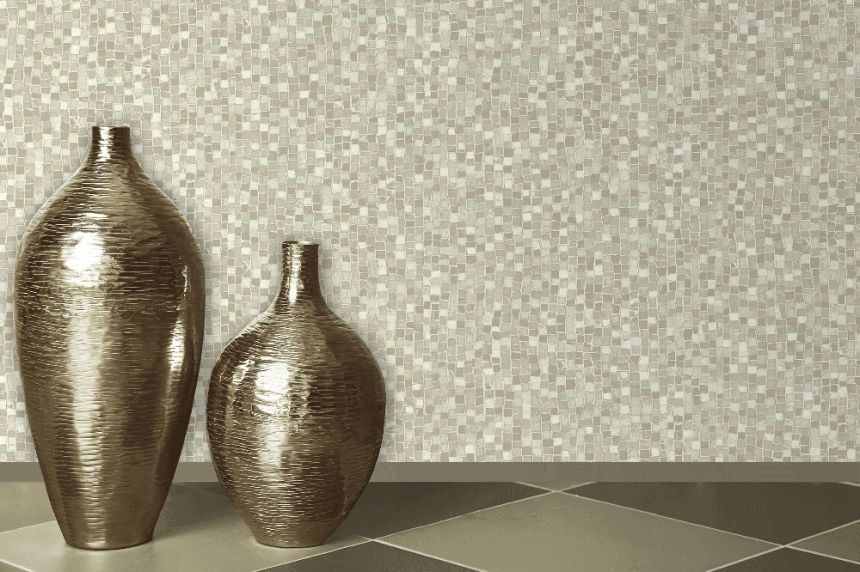 Small mosaic design in creamy and gray-beige shades, matt bronze joints. Wallpaper is highly washable.