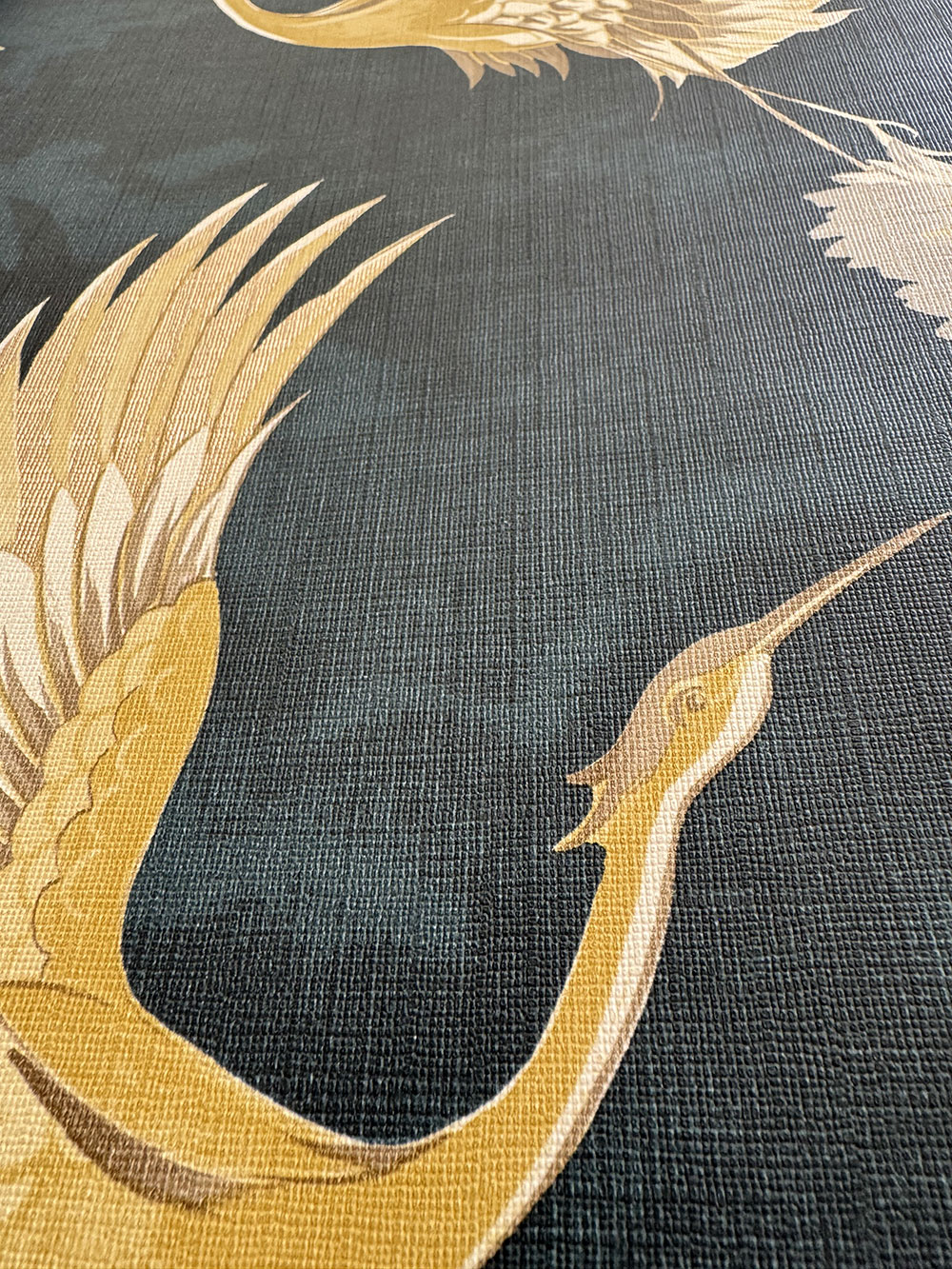 Petroleum blue non-woven wallpaper, motifs of flying cranes in shades of ochre, gray and rose gold.