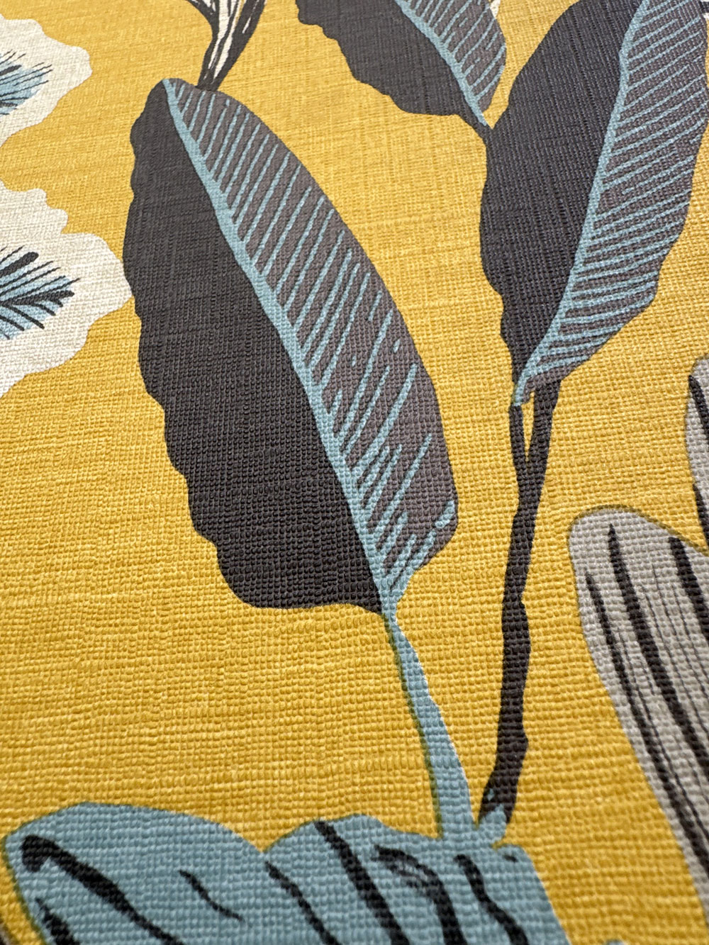 Ocher non-woven wallpaper, motifs of leaves in shades of turquoise, gray, brown and beige.