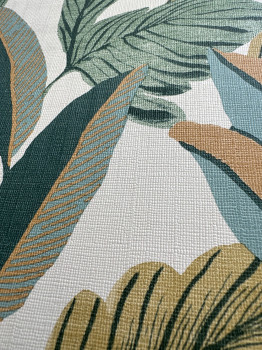 White non-woven wallpaper, motifs of leaves in shades of ochre, green, turquoise and brown-red.