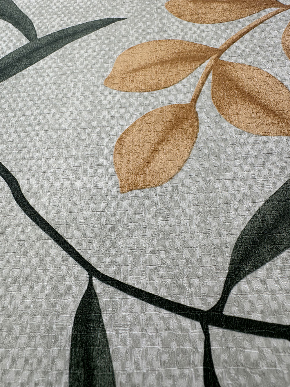 Green non-woven wallpaper, branches and leaves in shades of green and ocher, the appearance of a coarser textile.