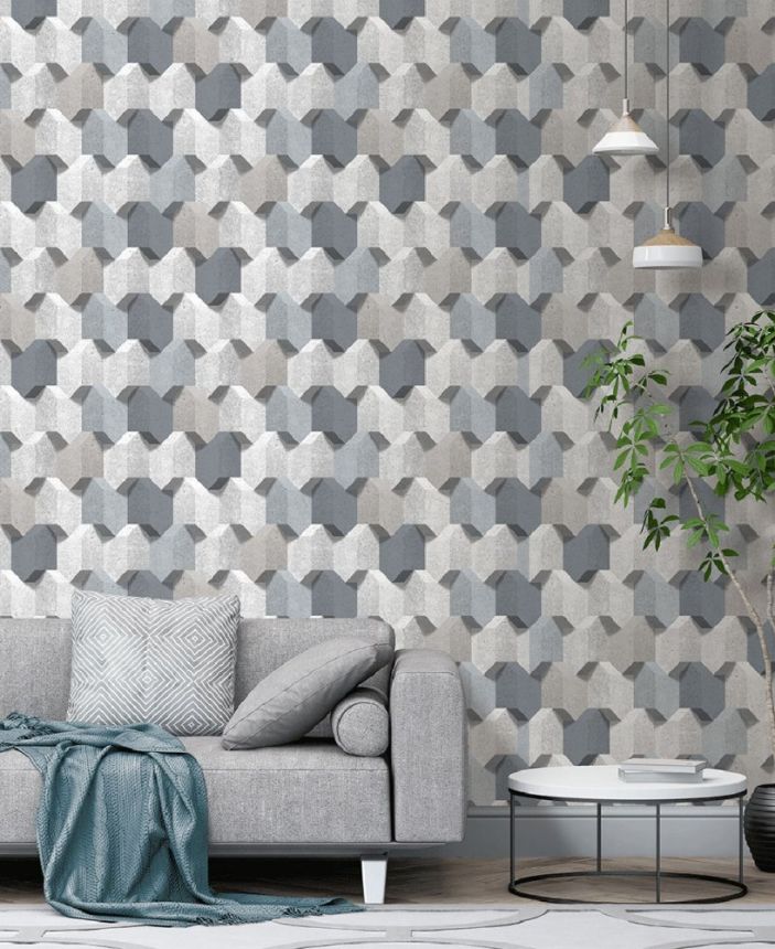 Unconventional geometric pattern in shades of gray, gray-blue, beige and anthracite.