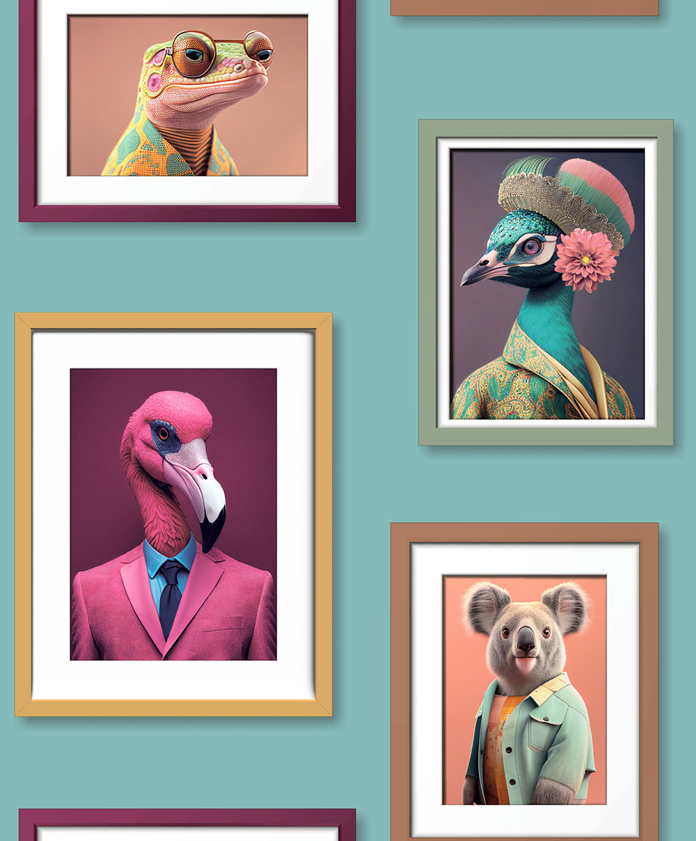 The Artfice collection offers a wide range of colors – from soft pastels that bring elegance and charm to bold, quirky designs like animals in suits that add a touch of humor and fun to your walls.
