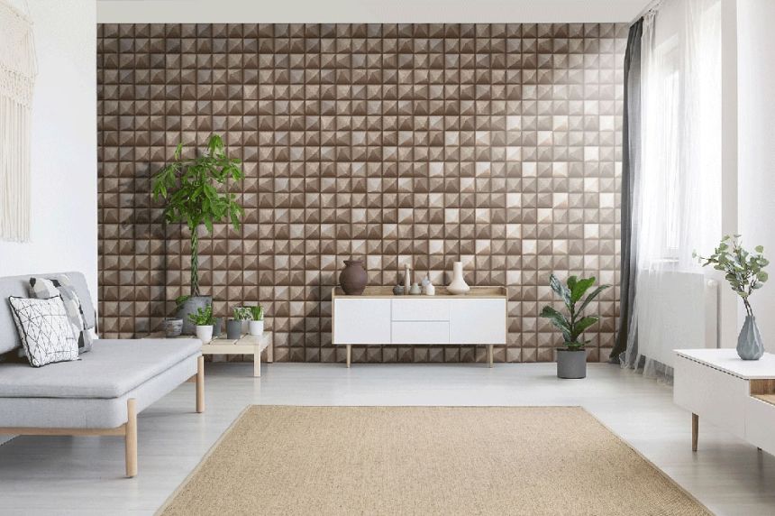 Square tiles design in matt brown, brown-gold and silver tones. Play of colors and shades creates a 3D effect. Smooth, finely grain texture.