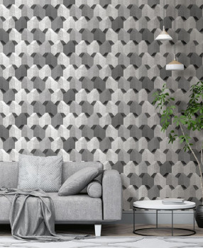 Geometric patterns bring a new dimension into interior. Unconventional geometric pattern in shades of gray, black and silver.