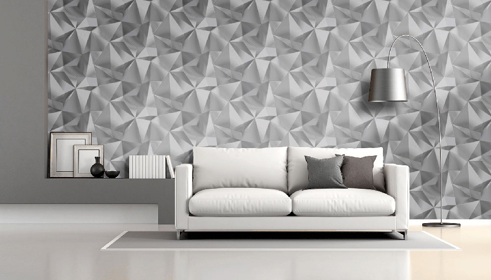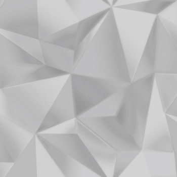 Smooth, metallic wallpaper, black and silver geometric patterns. Play of colors and tones creates a 3D effect.