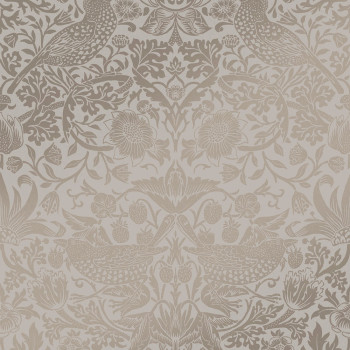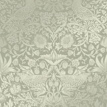 Non-woven wallpaper, rich ornamental pattern with flowers, leaves, birds and strawberries; sage green background, metallic, metallic shiny pattern.