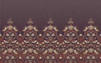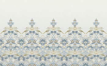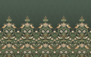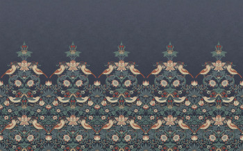 Non-woven wallpaper, rich ornamental pattern with flowers, leaves, birds and strawberries, shades of blue, green, brick red and beige.