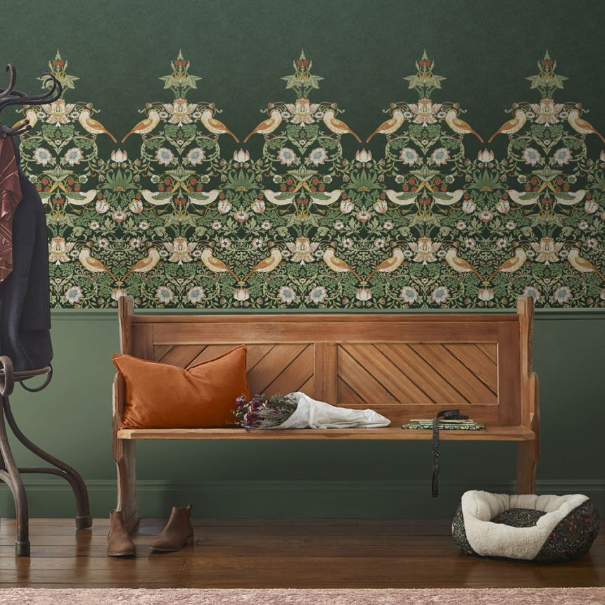 Non-woven wallpaper, rich ornamental pattern with flowers, leaves, birds and strawberries, shades of green, pink and ochre.