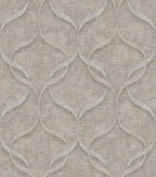 Gently embossed non-woven wallpaper with vinyl surface, imitation of coarser fabric in shades of brown-gray, ornamental pattern semi-gloss gray and brown.