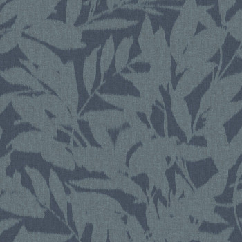 Non-woven wallpaper, leaf motifs in shades of blue, the background evokes a fabric texture.