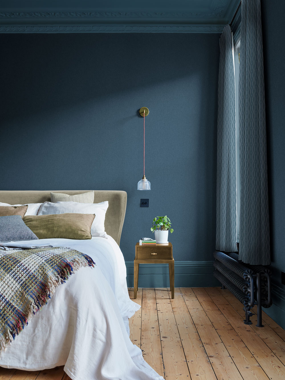 Smooth wallpaper, fabric-look design in shades of dark blue.