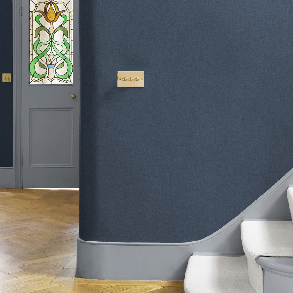 Smooth non-woven wallpaper, design imitating fabric structure in shades of dark blue and gray-black.
