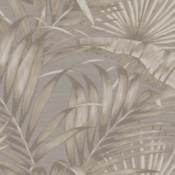 Luxurious, embossed, non-woven wallpaper with vinyl surface, shades of brown-gray, tropical leaves with metallic semi-gloss.