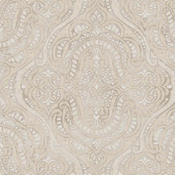 Luxurious, embossed, non-woven wallpaper with vinyl surface, shades of gray-beige, beige ornamental baroque pattern with a soft golden semi-gloss.