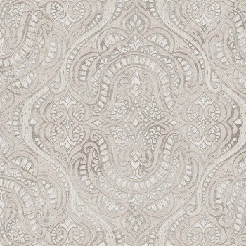 Luxurious, embossed, non-woven wallpaper with vinyl surface, gray background, light beige ornamental baroque pattern.