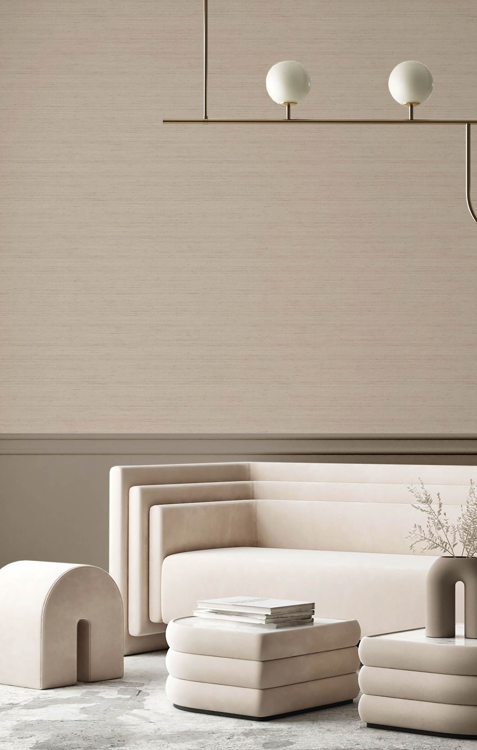 Luxury non-woven wallpaper with vinyl surface, Shantung fabric effect in shades of beige.