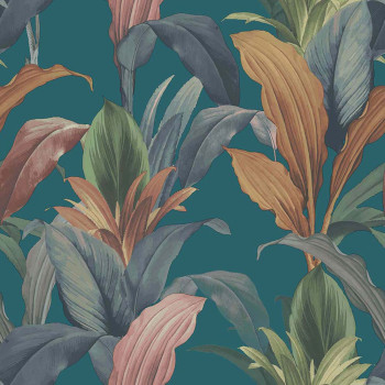 Non-woven wallpaper, leaf motifs in shades of turquoise, green and ochre and brown.