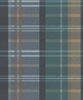 Non-woven wallpaper, imitation tartan fabric in shades of turquoise, blue and brown-bronze.