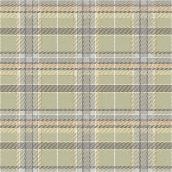 Non-woven wallpaper, imitation tartan fabric in shades of green, ochre and grey.
