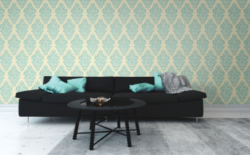 Turquoise ornamental pattern on a beige semi-glossy background.