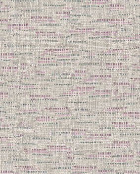 Non-woven wallpaper, imitation of coarser fabric in shades of gray-brown-beige, purple and turquoise in places, distinctly embossed texture. Luxury retro wallpaper will create a playful atmosphere in your bedroom or living room.