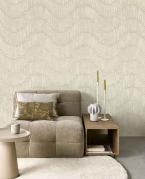 Non-woven wall mural, shades of beige and gray-beige, wave design imitating rustic fabric.