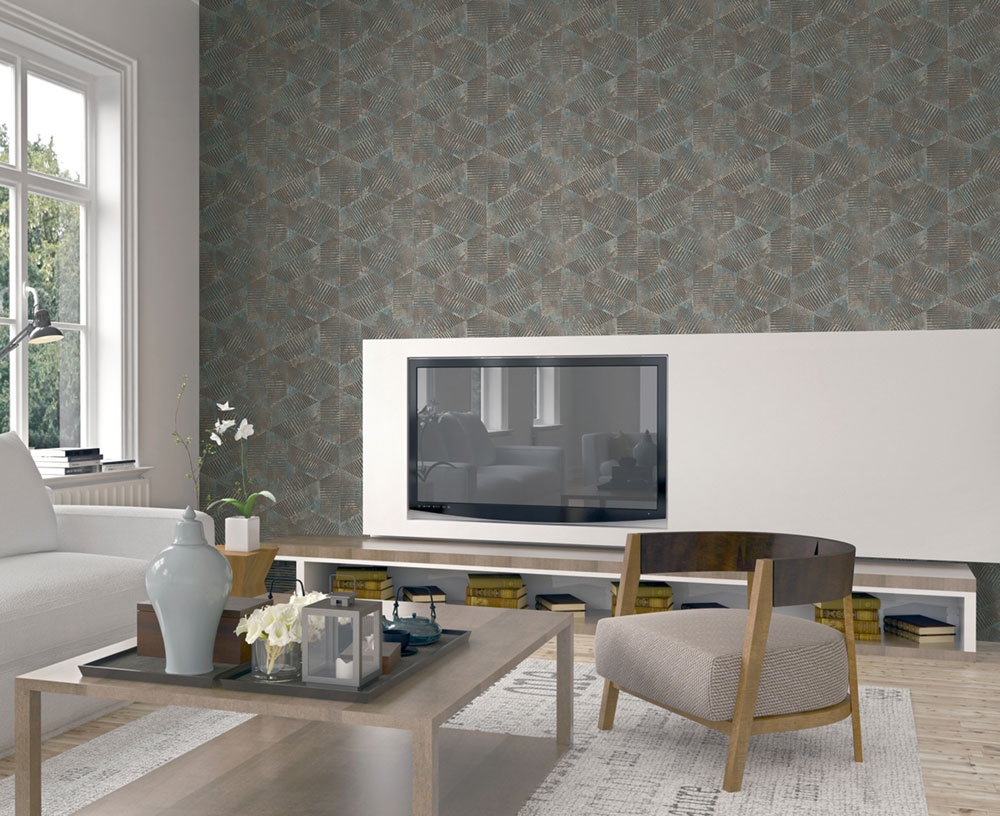 Unconventional geometric pattern in shades of a semi-gloss brown and turquoise.