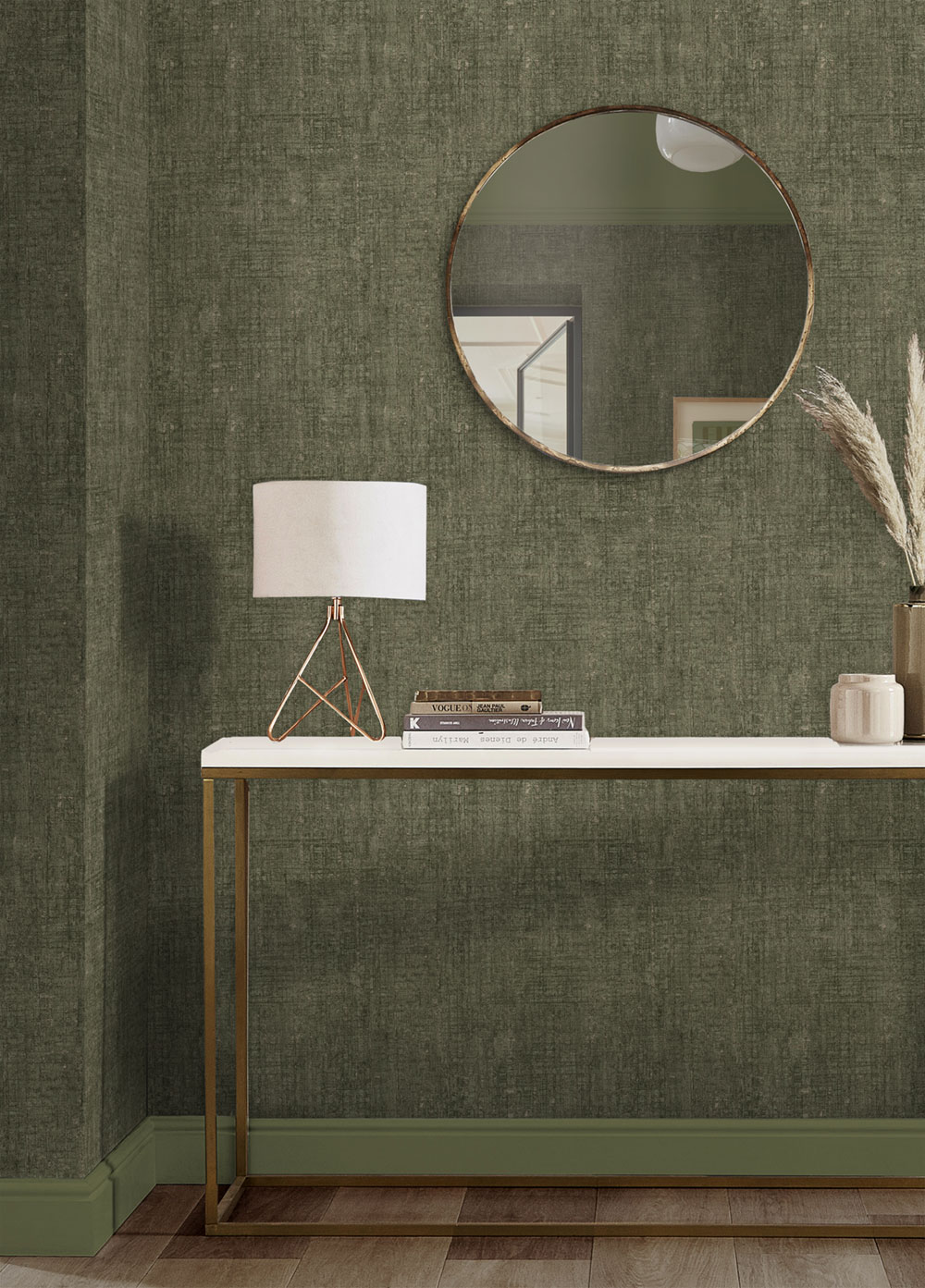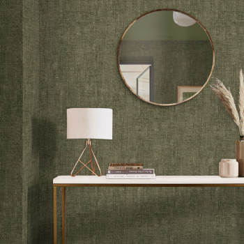 Smooth wallpaper, textured design in shades of emerald green with subtle beige undertones.