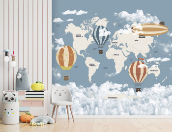 Non-woven wallpaper, children's motif of a world map with balloons and airships, shades of blue, white, ochre and brown.