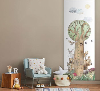 Non-woven wallpaper / tape, children's motif of a tree and forest animals, shades of green, blue, grey, brown, red, yellow, white background.
