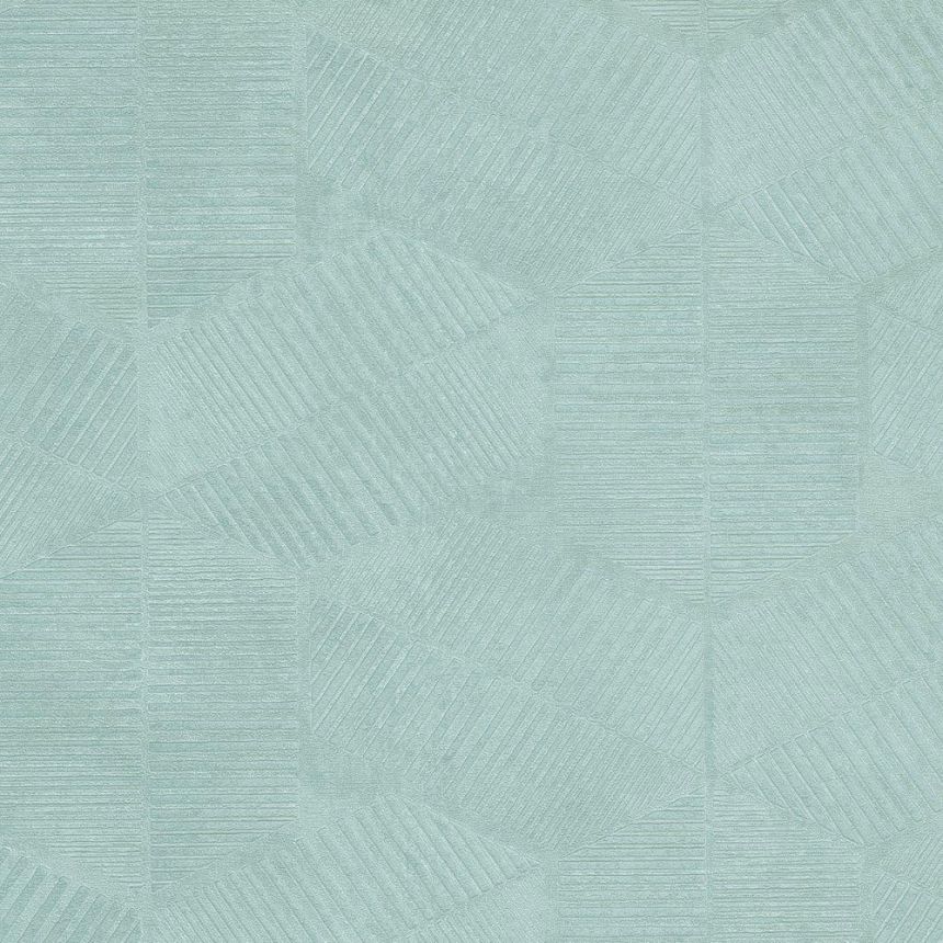 Unconventional geometric pattern in shades of a semi-glossy turquoise. Can be easily combined with related patterns. Non-woven backing, vinyl surface.
