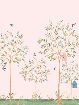 Non-woven wallpaper, motif of trees, birdhouses and birds, shades of pink, green, brown, yellow and blue.