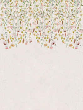 Non-woven wallpaper, motif of flowers, leaves and birds, shades of green, ocher and pink.