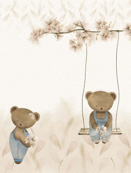 Non-woven wallpaper, children's motif of teddy bears on a swing in shades of beige, blue and brown.