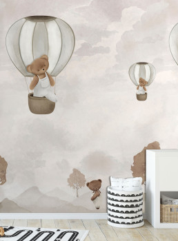 Non-woven wallpaper, children's motifs of teddy bears and balloons in shades of grey, brown and beige.
