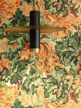Smooth non-woven wallpaper, floral pattern in shades of green, orange and beige, with a subtle semi-gloss in places.
