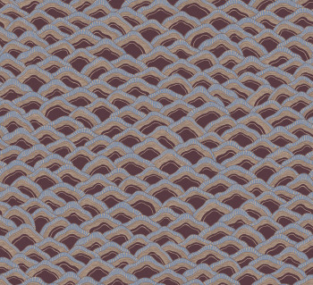 Non-woven wallpaper, subtly embossed, semi-gloss pattern inspired by mountain landscapes, shades of burgundy, blue and brown, beige metallic details.