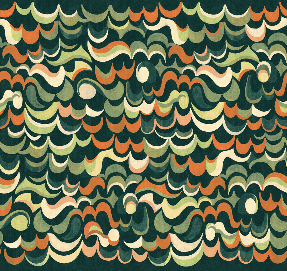Non-woven wall mural, wave pattern in shades of green and brick red.