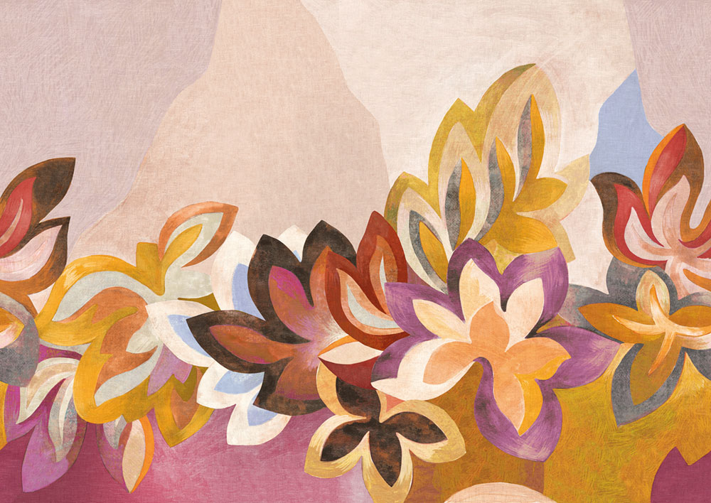 Non-woven wall mural, floral pattern in shades of burgundy, purple, orange, blue.