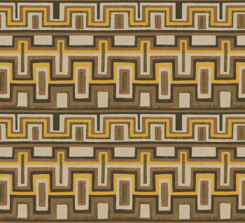 Non-woven wallpaper, delicately embossed graphic ethno pattern in shades of brown, beige, ocher, gold accents.